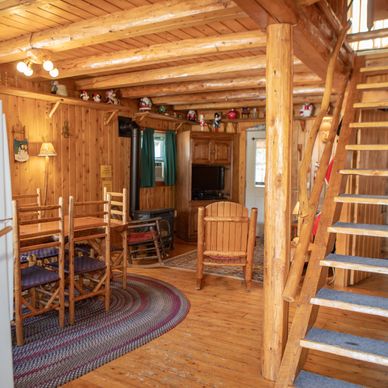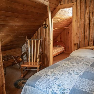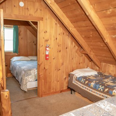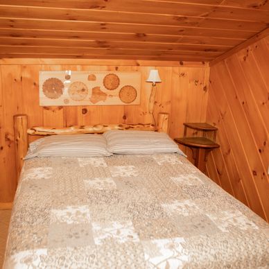 An open loft, accessed using a log ladder, has one full size bed. From the loft you can access the separate bedroom with a full, a twin and a youth bed.