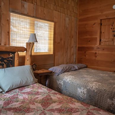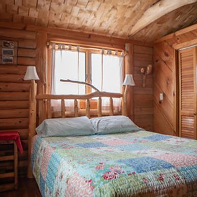 The Rocks is a ranch style, log home with two bedrooms. One bedroom has a queen size bed; the other bedroom has a queen and full size bed.