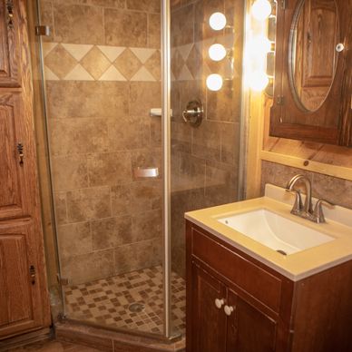 This is one of the two cabins that offers a full bath with a shower/tub combo.
